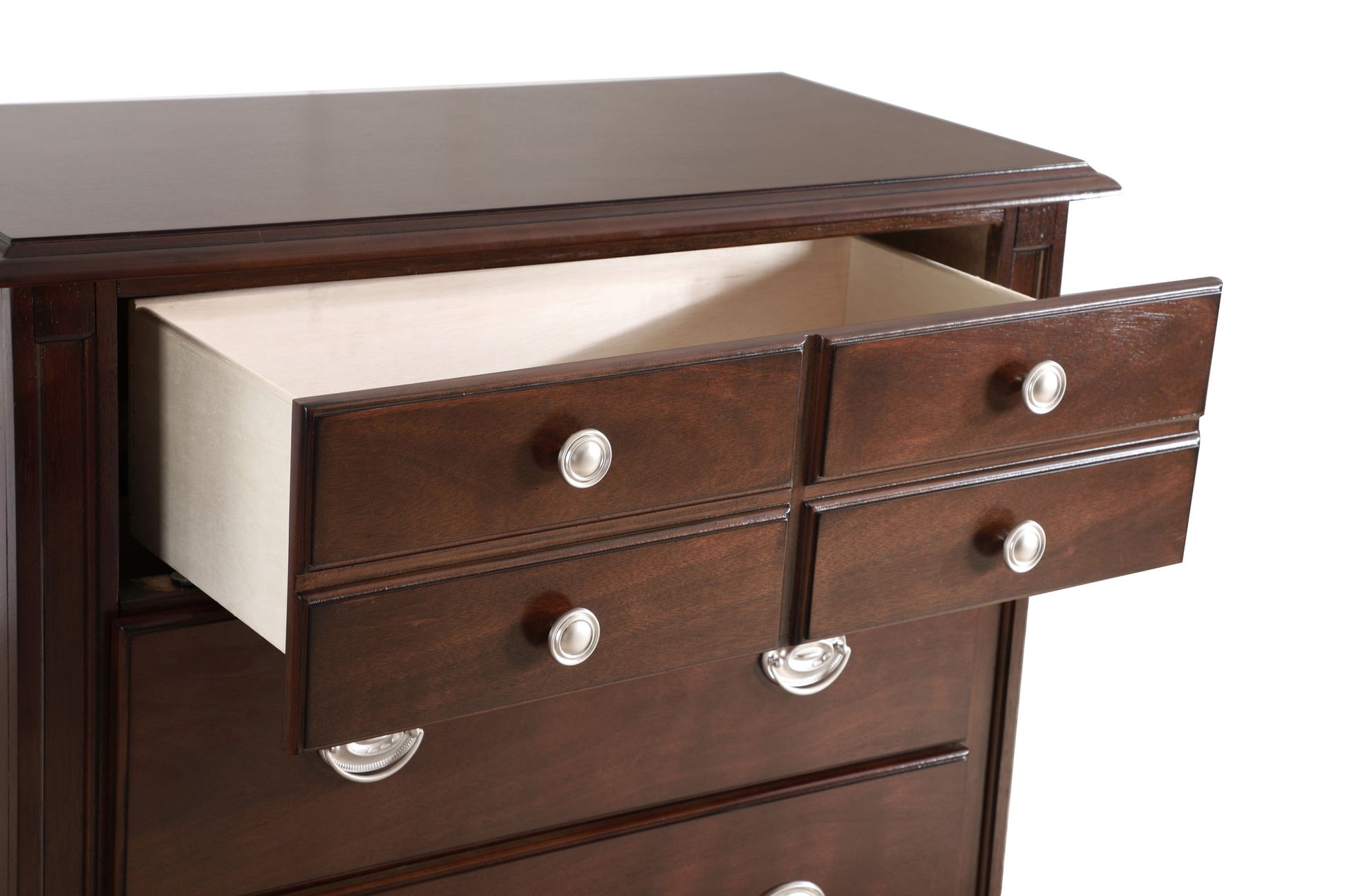 This captivating chest offers ample storage space while highlighting modern design, making it a functional addition to any home setting. The rich cappuccino finish beautifully enhances the wood veneer, creating a warm, inviting look that complements a variety of decor styles, from contemporary to traditional. With a sleek silhouette and clean lines, it introduces an elegant touch that seamlessly blends in with your interior. Thoughtfully crafted dovetailed drawers ensure reliable organization and easy access to your belongings, making this piece an ideal choice for keeping your space orderly. Each drawer operates smoothly, allowing for hassle-free retrieval. The use of high-grade materials ensures you can enjoy this piece for years ahead. With overall dimensions of 53"H x 37"W x 18"D, this chest offers significant storage while fitting comfortably into your room, enhancing functionality without overwhelming your space.
