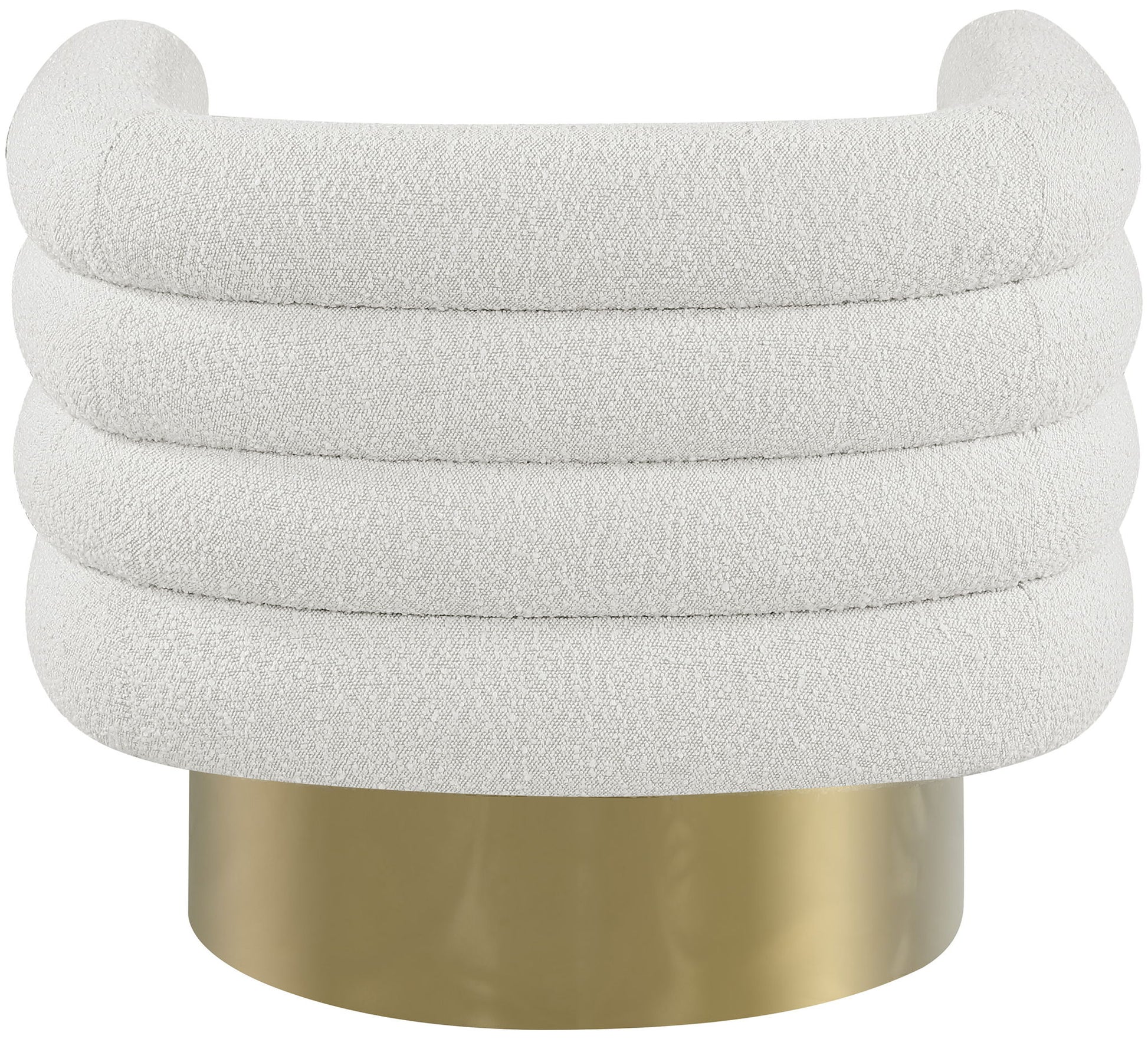This Tessa boucle fabric accent chair is destined to become a conversation piece wherever you choose to use it. This eye-grabbing chair features a brushed base that supports the body of the chair. Rich boucle fabric upholstery covers every inch of the chair's body, giving it a welcoming feel that's soft and inviting to the touch. Deep channel tufting adds to the contemporary flair of this swiveling accent chair.