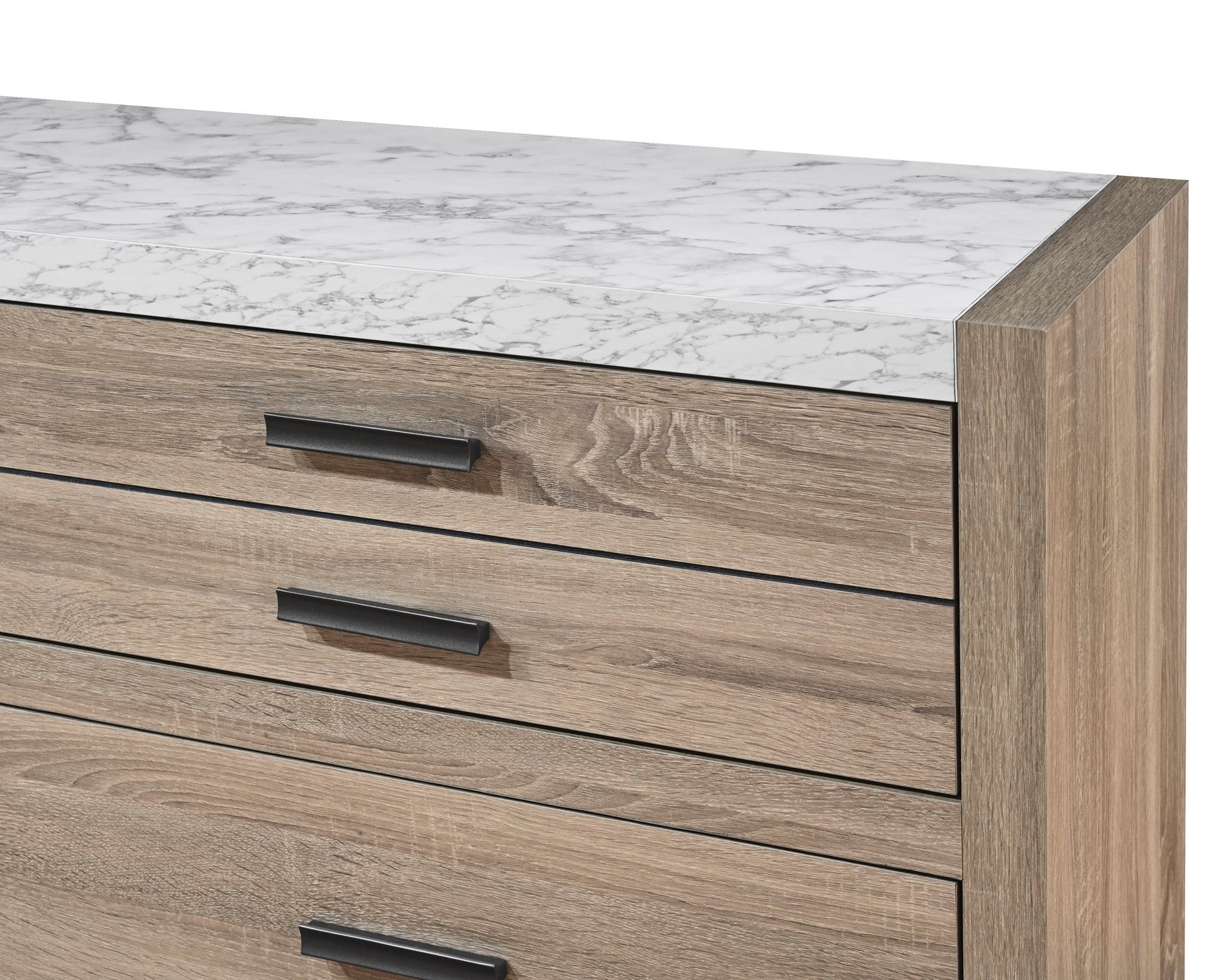 This bedroom collection brings a breath of fresh air to any interior with its light, natural wood finish that evokes a sense of calm and simplicity. The well-crafted bed frame, with its clean lines and subtle headboard design, provides a modern rustic charm that's both understated and inviting. Stylish night stands with integrated lighting backs flank the bed, creating a wall bed effect. Faux stone tops accent the storage pieces for extra luxury.