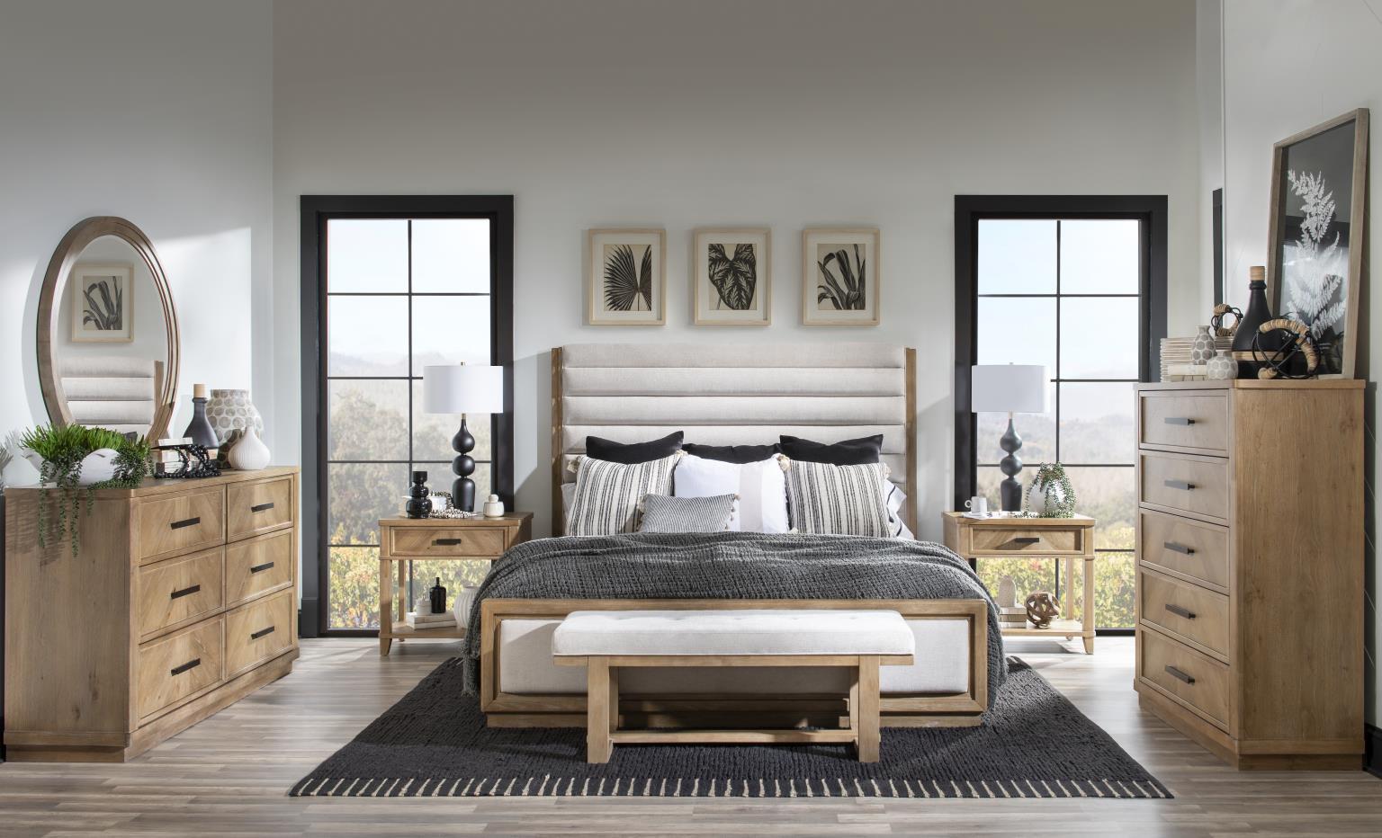 The Torrance whole home collection offers a warm and inviting contemporary casual design with an organic Aged Driftwood finish and a California coastal vibe. Crafted of random match White Oak with Split Heart Cathedral Veneers in a herringbone pattern on the drawer fronts and tabletops,, the bedroom,, dining and occasional pieces have clean lines,, plinth bases and a light and airy tone. Oxidized Bronze hardware adds a rustic elegant touch.