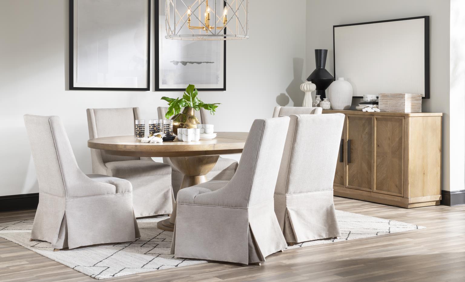 The Torrance whole home collection offers a warm and inviting contemporary casual design with an organic Aged Driftwood finish and a California coastal vibe. Crafted of random match White Oak with Split Heart Cathedral Veneers in a herringbone pattern on the drawer fronts and tabletops,, the bedroom,, dining and occasional pieces have clean lines,, plinth bases and a light and airy tone. Oxidized Bronze hardware adds a rustic elegant touch.