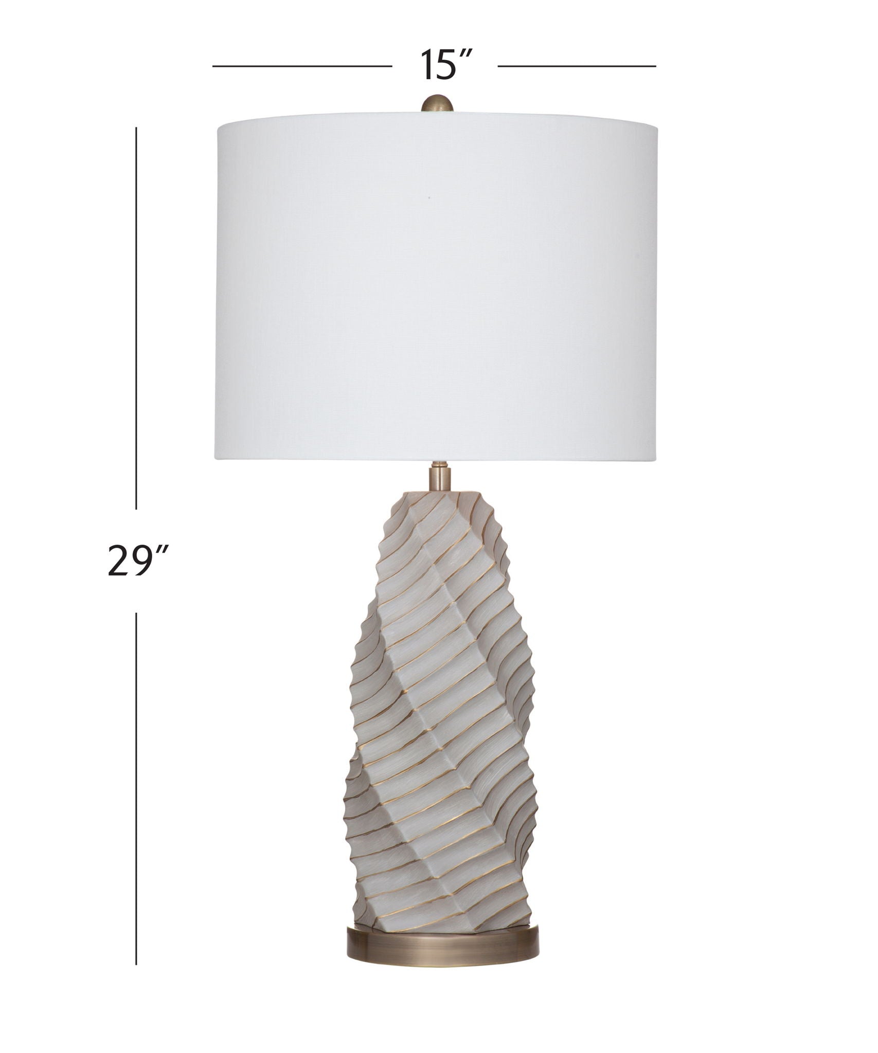 The Vanessa Table Lamp features an elegantly spiraled body, adding a dynamic sense of movement to the design. Its textured surface and the neutral color palette emphasize the lamp's sophisticated and contemporary aesthetic. The base's sculptural form is complemented by a brass-finished base that adds a hint of warmth and luxury. Topped with a wide, white lampshade, the Vanessa Table Lamp diffuses light beautifully, making it both a striking decorative piece and a source of ambient lighting.