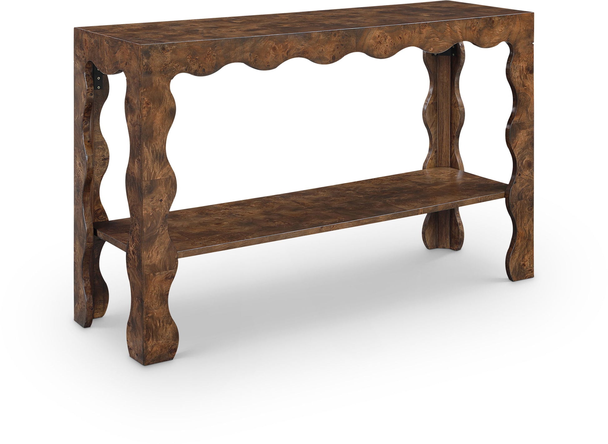 Sculptural curves and a mesmerizing burl veneer make the Vassa console table a standout piece with art deco appeal. Swirls of wood grain dance across the surface, creating an eye-catching focal point that exudes warmth and sophistication. Perfect for anchoring a living room with bold, artistic flair.