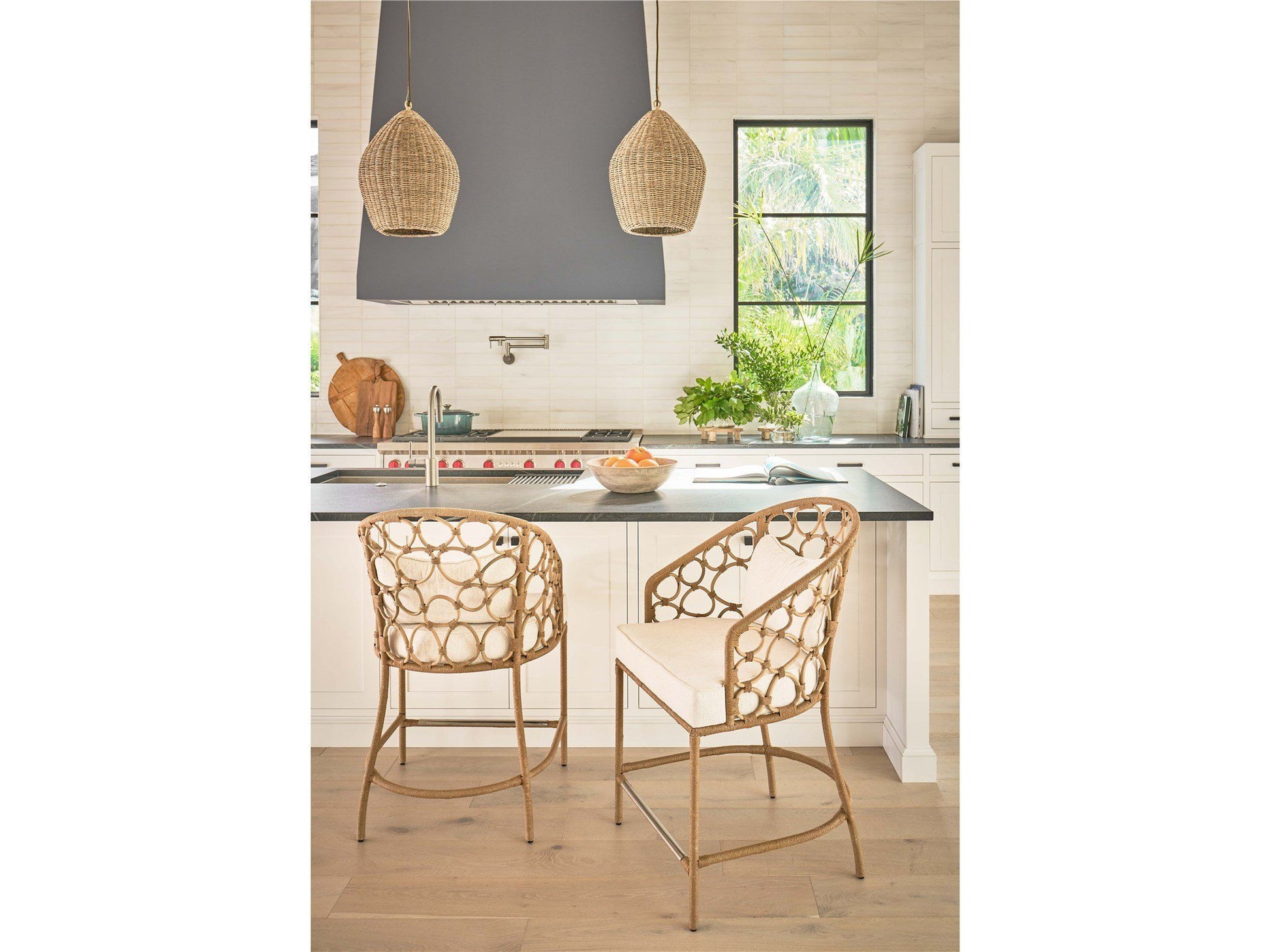 Rattan is woven into a series of circles, creating a soothing pattern in the Pebble Counter Stool. The stool also features an upholstered seat and kidney pillow for added comfort and style.
