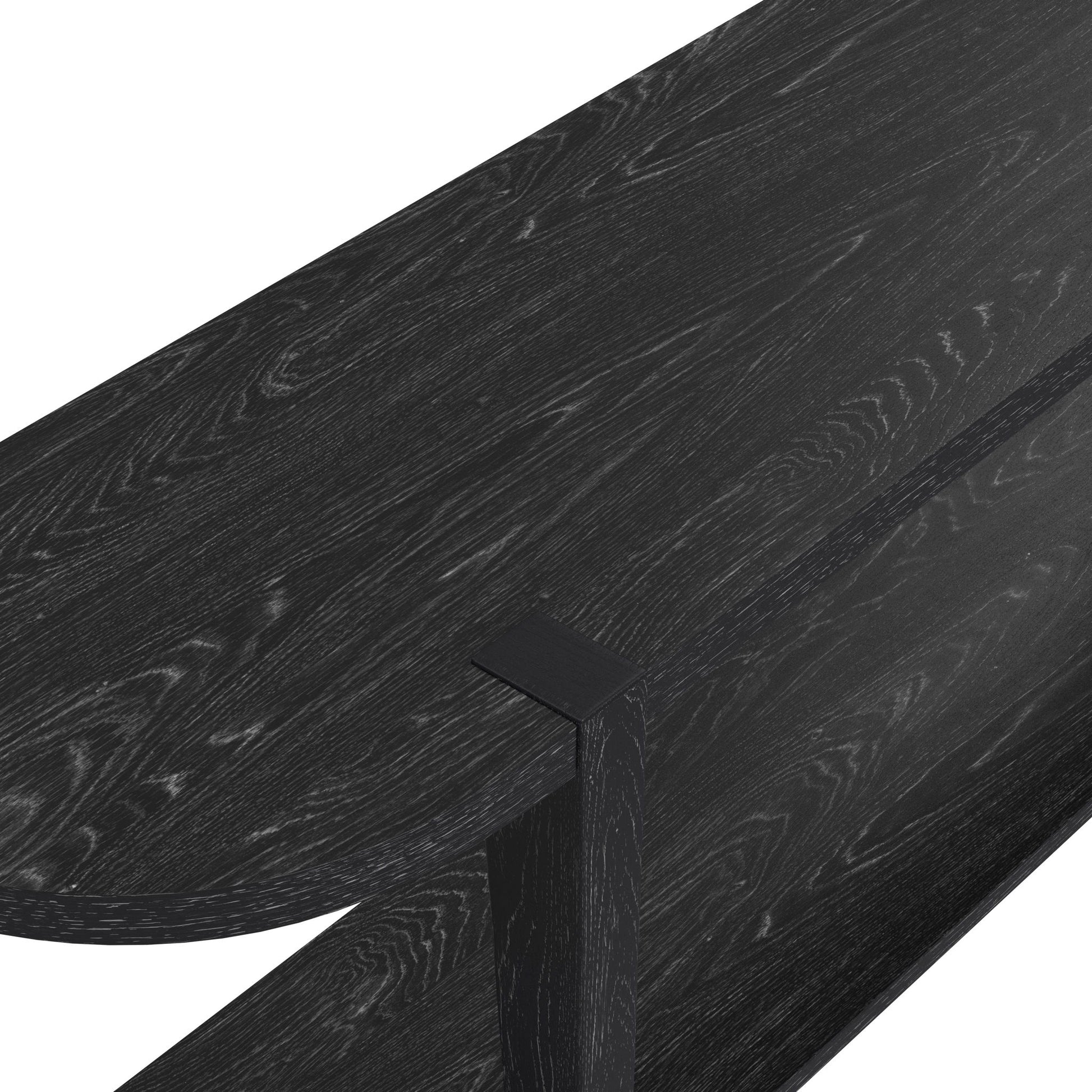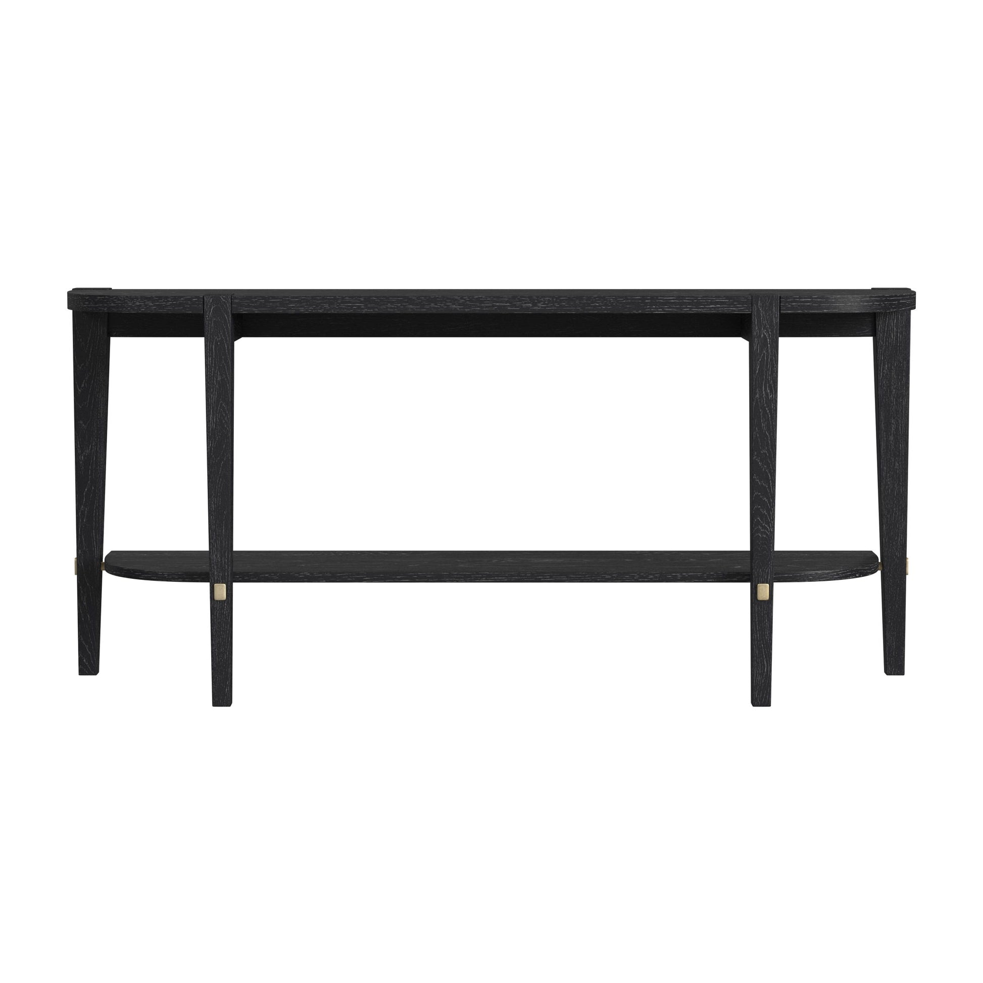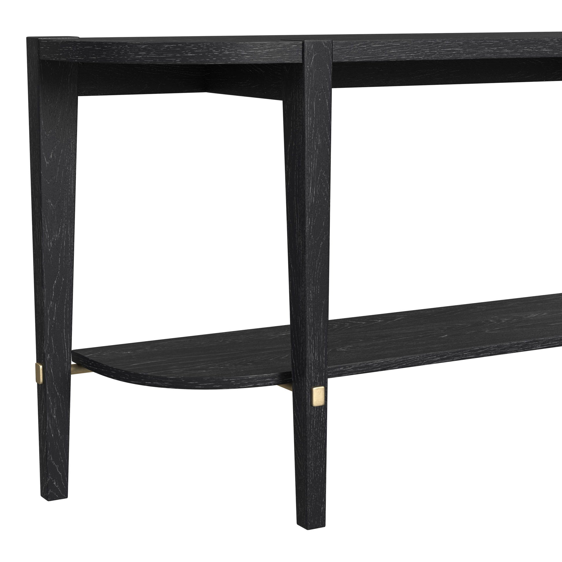 The Whitfield Console has a modern style. The legs and top feature an interlocking design, constructed with rubberwood solids and flat-cut, cerused oak. The table is finished in a black stain with generous white wax hang-up in the open grain. Brushed gold cross bars accent the base, piercing through the legs.