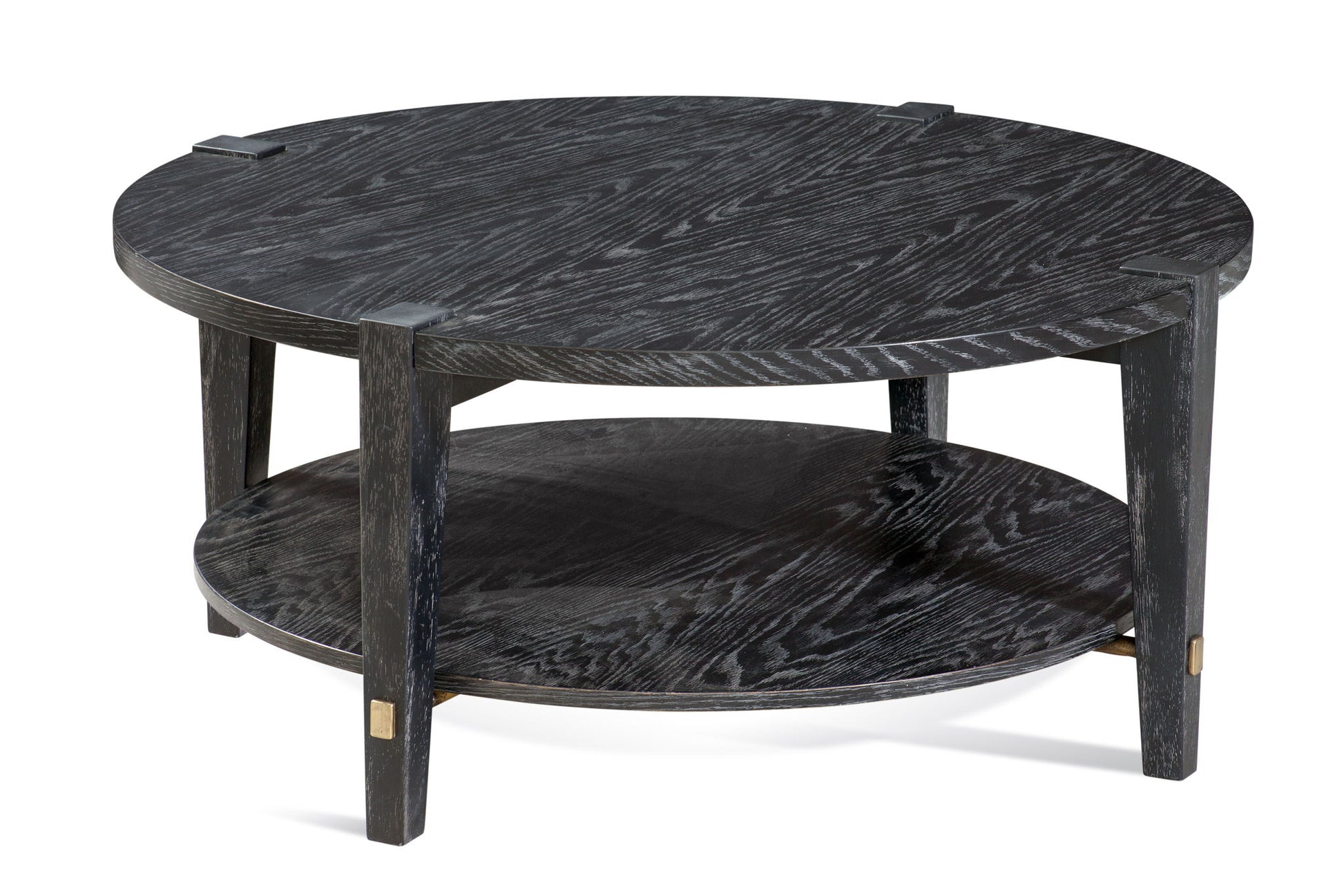 The Whitfield Cocktail Table has a modern style. The legs and top feature an interlocking design, constructed with rubberwood solids and flat-cut, cerused oak. The table is finished in a black stain with generous white wax hang-up in the open grain. Brushed gold cross bars accent the base, piercing through the legs.