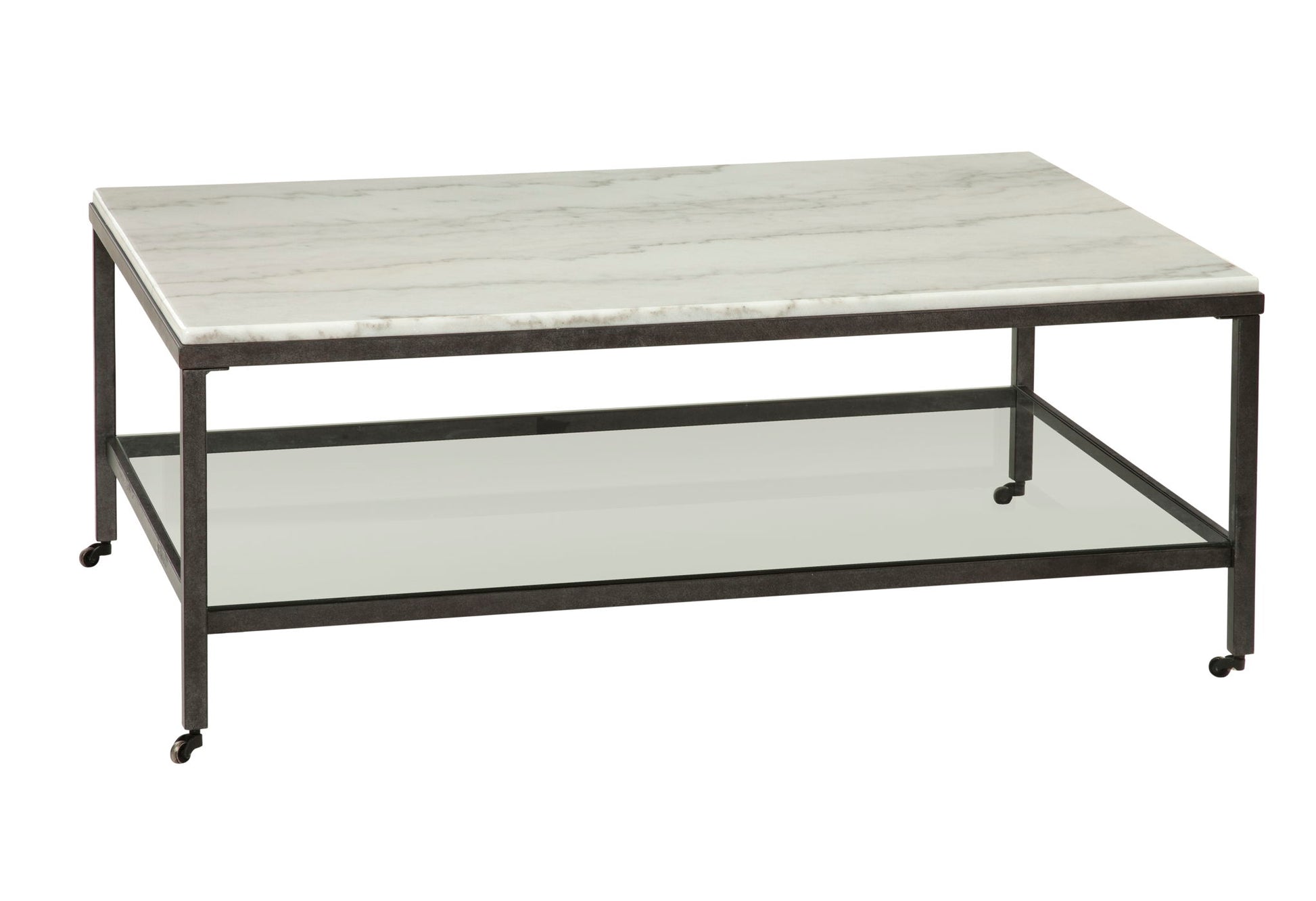 The Whitman Rectangular Cocktail Table features a striking contrast between bronze and ivory marble. The solid stone tops rests on a steel base and features piano casters for added functionality. This rectangular coffee table is accented with a clear glass shelf for extra storage.
