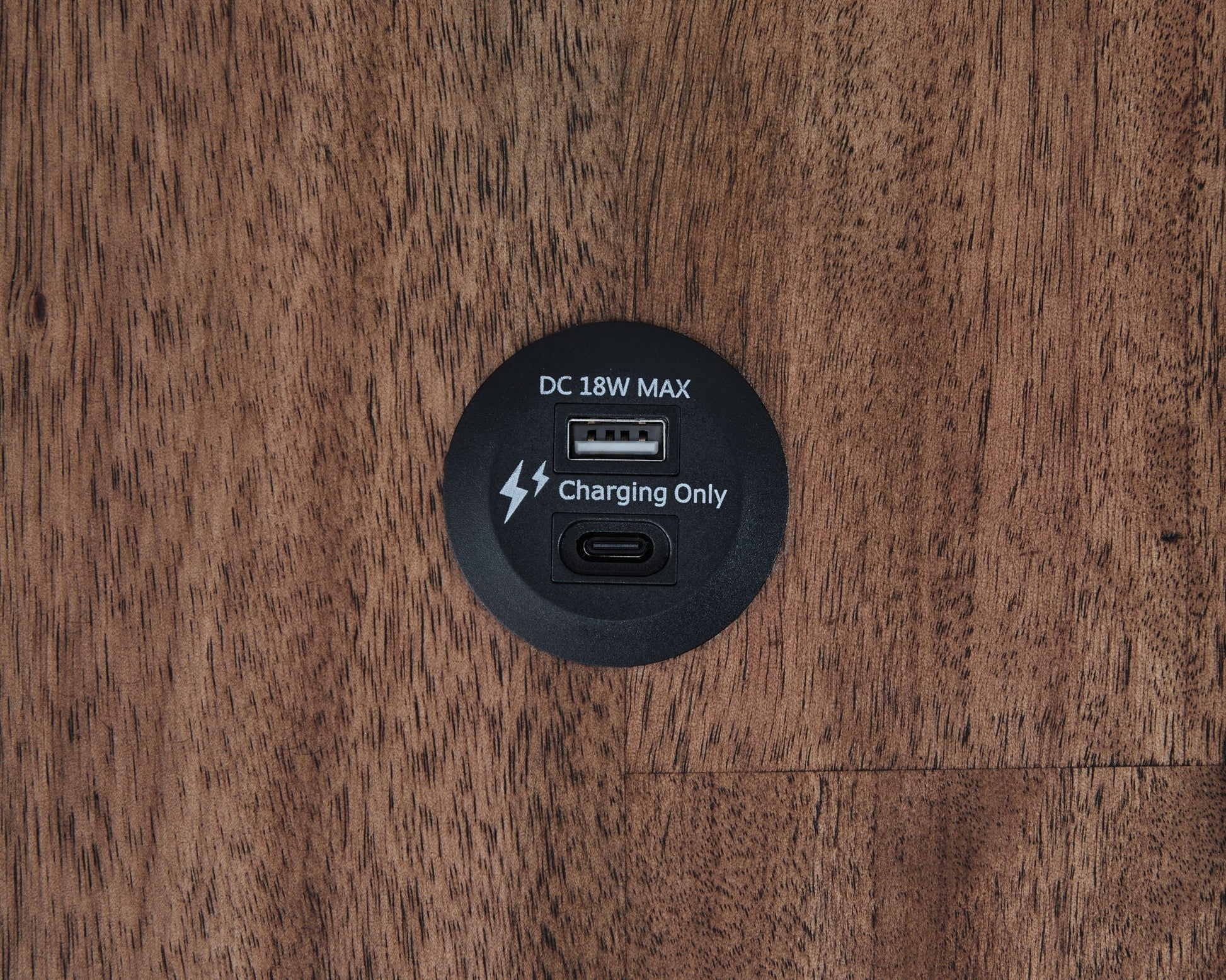 Raise the bar on modern farmhouse style with this end table. Its sturdy silhouette and casual good looks are accentuated with a two-tone finish, which pairs a warm satin black base with a contrasting butcher block veneer top. A spacious storage drawer and dual USB charging ports keep devices powered up and close at hand. Whether your style is vintage, country or eclectic, this table adds a hearty element.