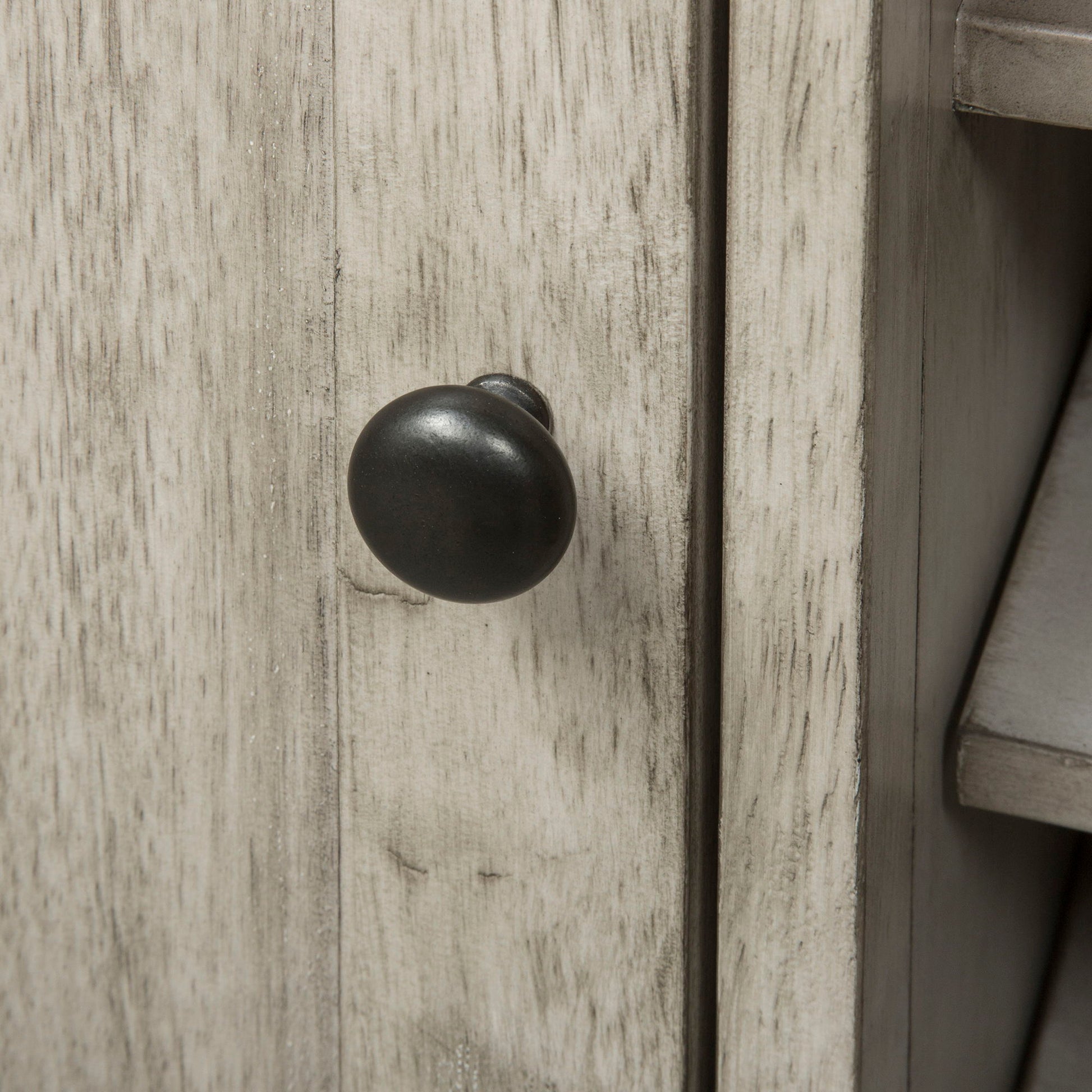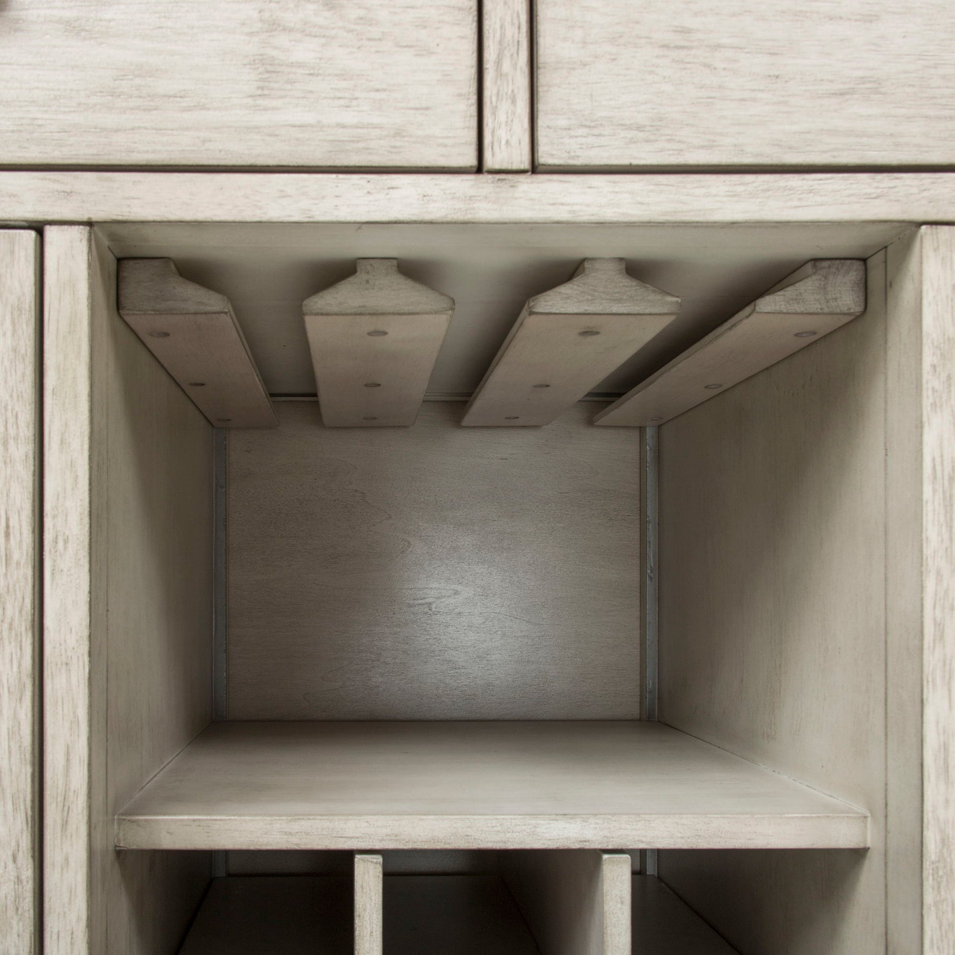 Enhance your dining space with the Willowrun sideboard. Crafted of rubberwood solids and acacia and pine veneers, this piece features a rustic white finish with a weathered grey top, two full extension felt lined drawers for easy access to storage, two wood framed doors with one adjustable shelf behind each door, stemware storage for your wine glasses, a removable 9 bottle wine storage rack, and a center open shelf for extra storage or display. Willowrun offers a relaxed style, creating a classic look with a casual feel.