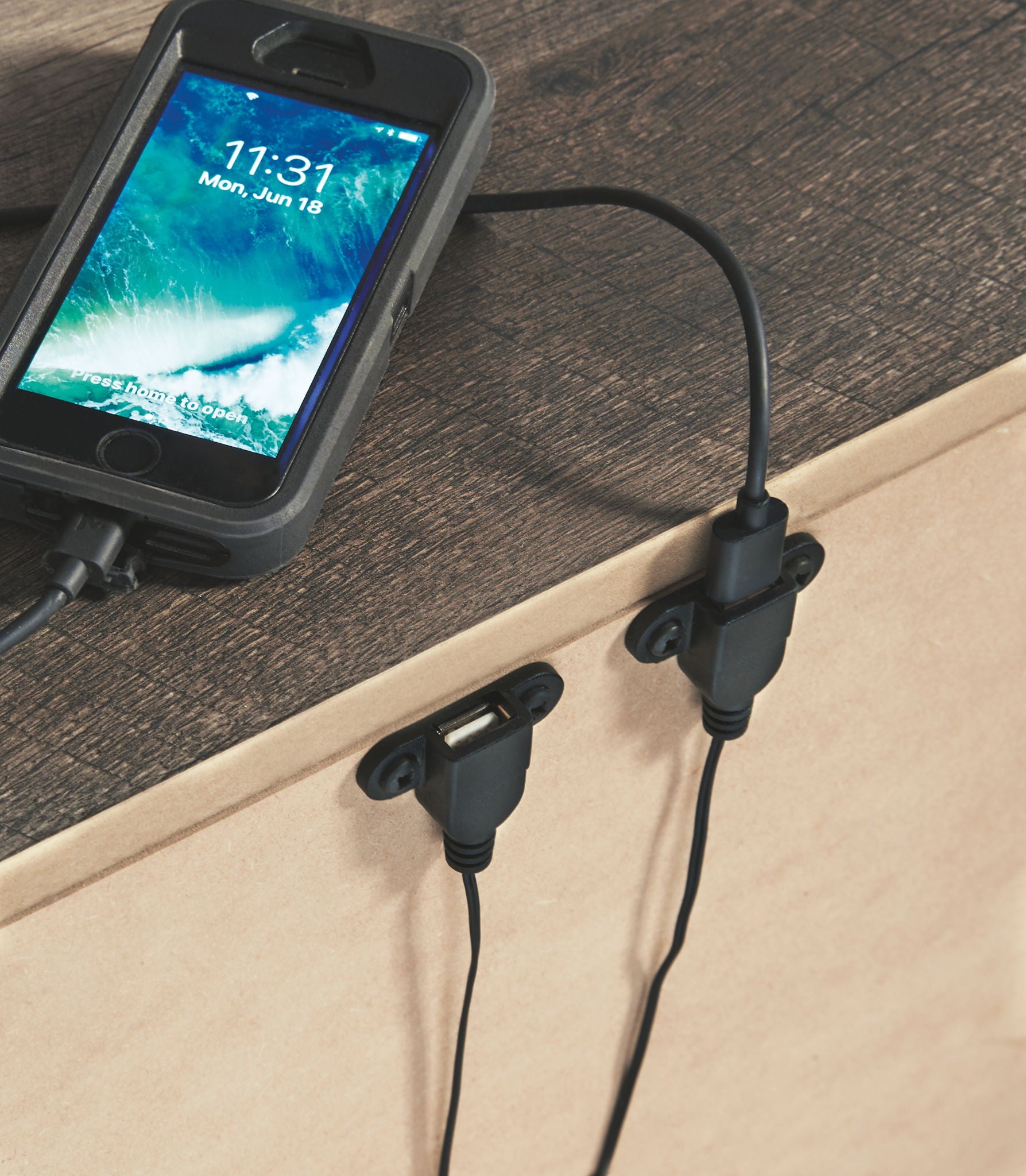 This nightstand is sure to win your heart with its daring designer take on modern rustic. The nightstand’s crisp, clean and minimalist-chic profile is enriched with a striking replicated oak grain with thick plank styling and a weathered gray finish for that much more authentic character. Large-scale hooded pulls gracing the flush-mount drawers add such a distinctive twist. Dual USB charger is discreetly placed and mighty handy.