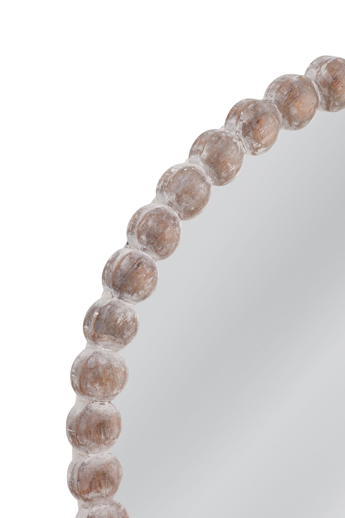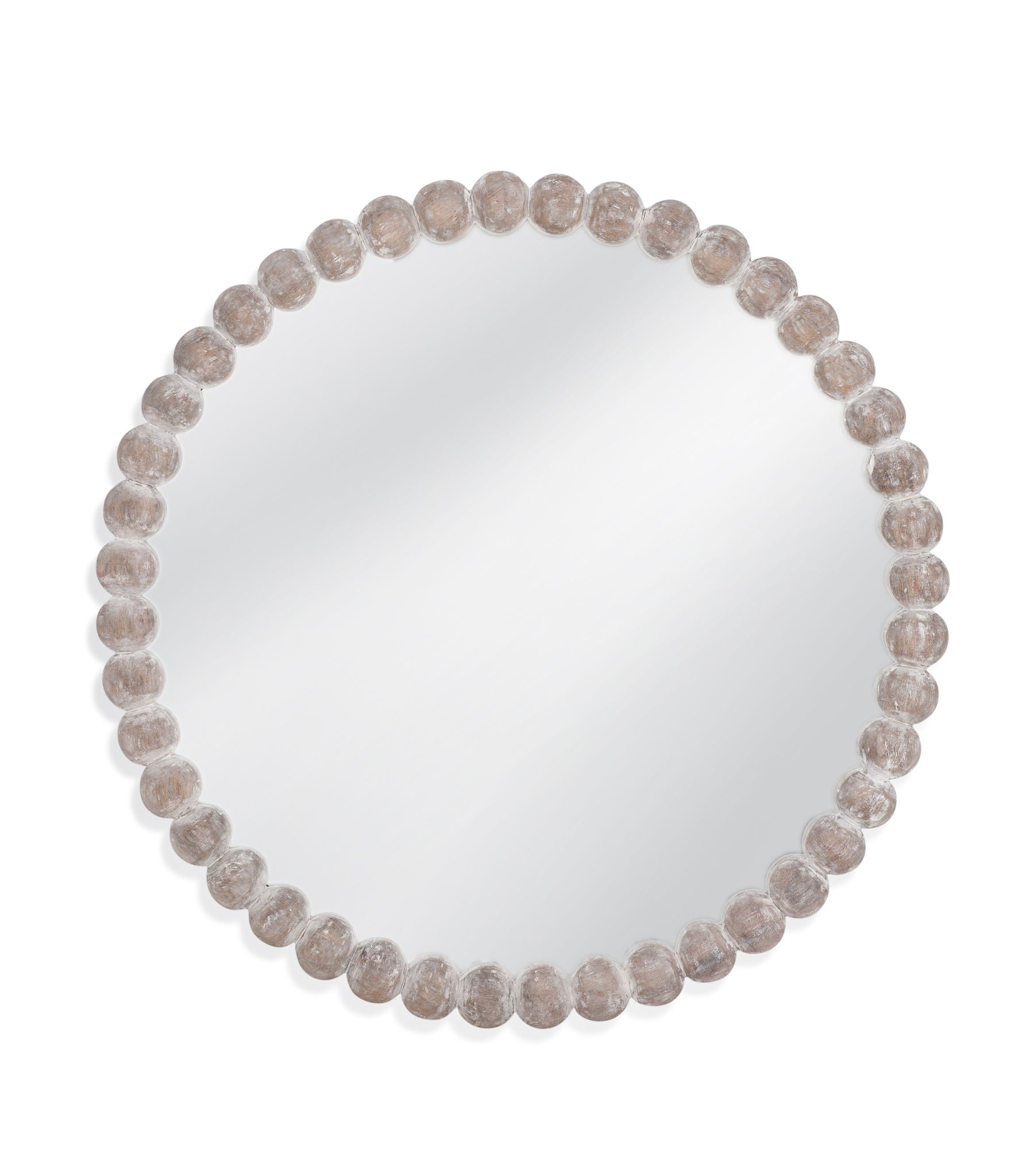 The Zeena Wall Mirror offers a charming round design with a bead-like frame finished in a subtle white wash, embodying the essence of modern farmhouse style. Its elegant yet rustic aesthetic adds warmth and character to any room, making it a versatile accent piece for your home decor.