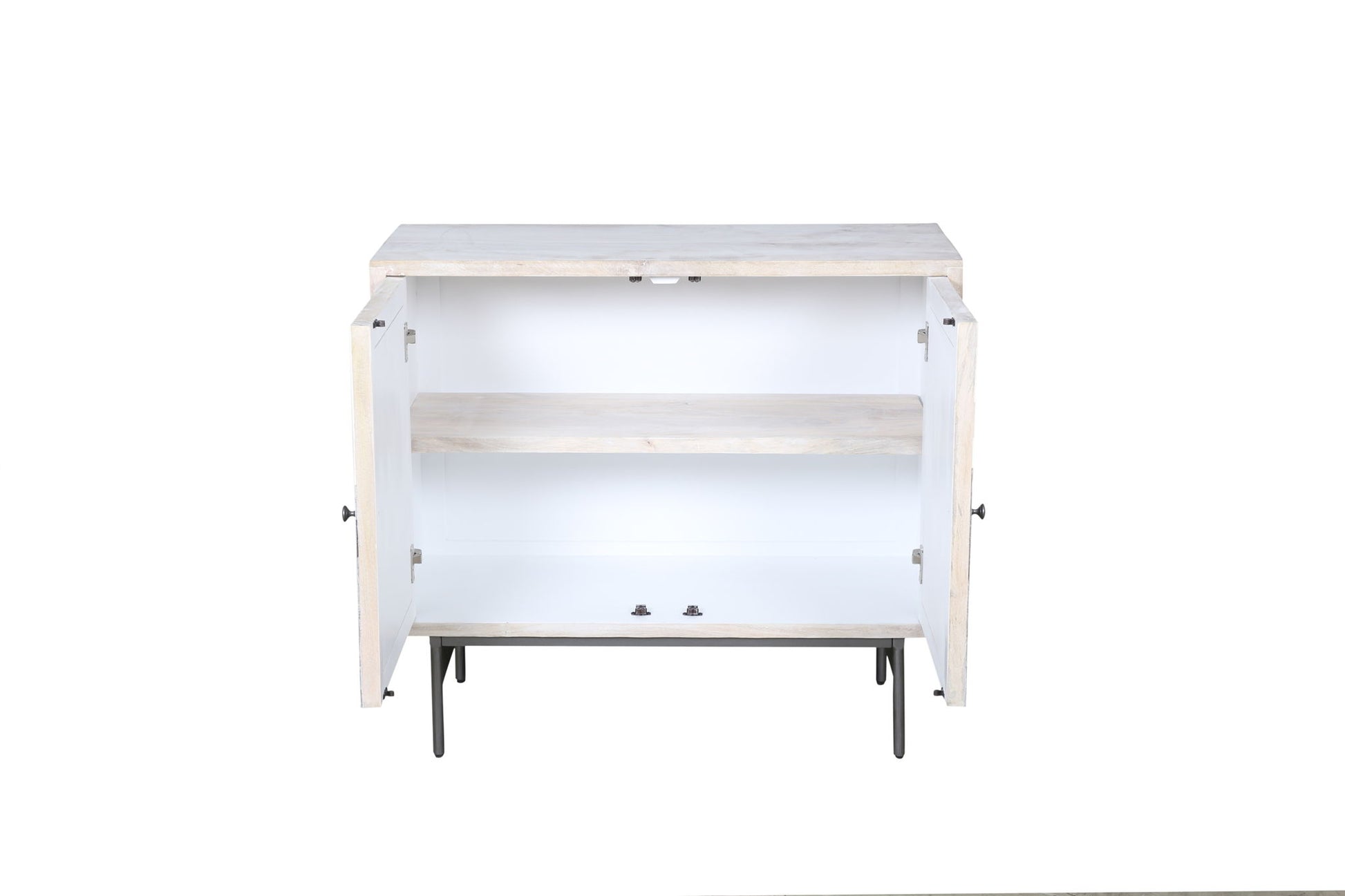 - The case frame is crafted from solid mango wood in a neutral white wash finish